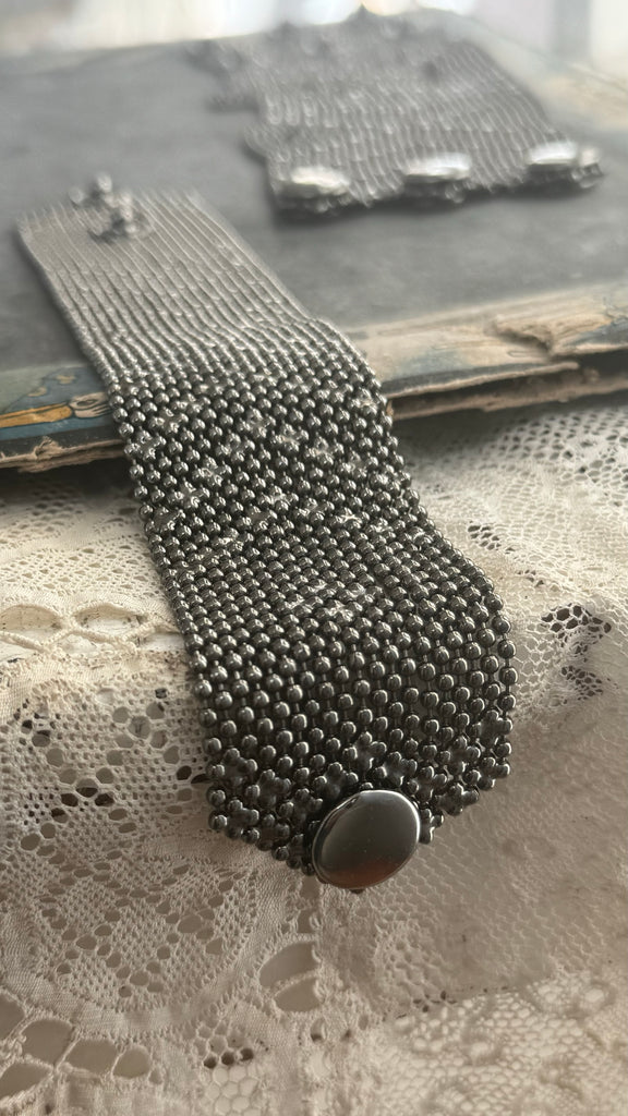 Handcrafted from oxidized alpaca silver, this flexible bracelet features a delicate beaded mesh with a subtle geometric pattern. The two snap buttons allow for adjustable sizing, making it comfortable and easy to wear while giving it a unique texture and vintage-inspired look.