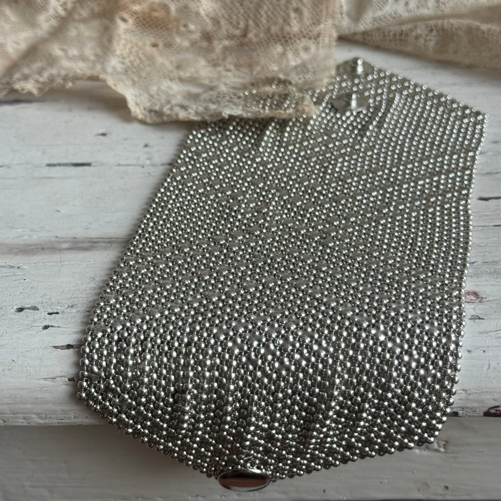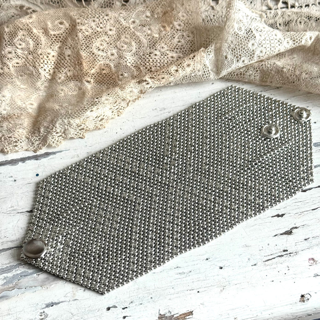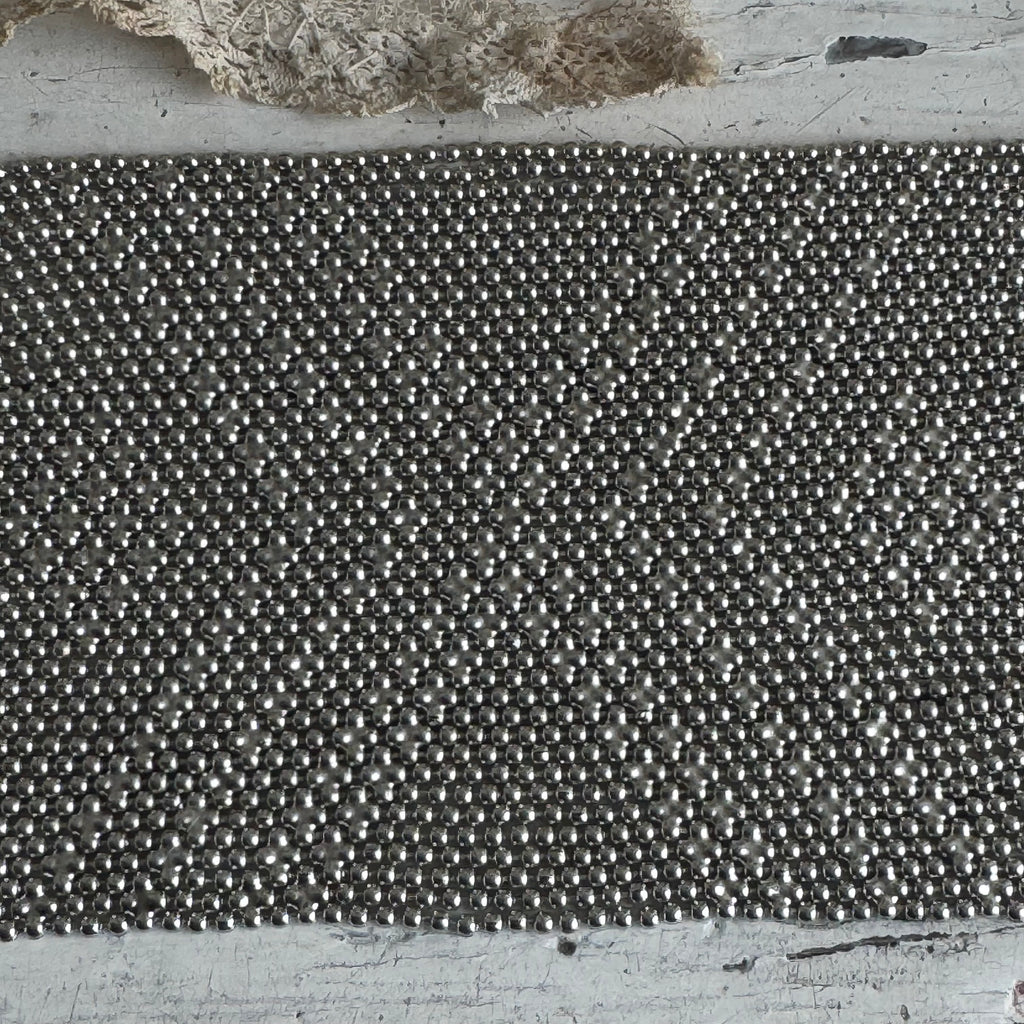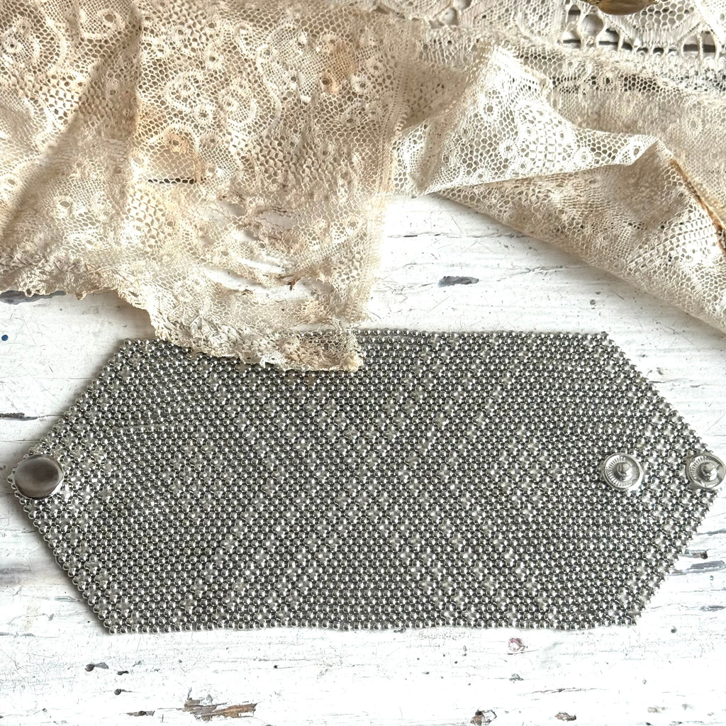 Handcrafted from alpaca silver, this flexible bracelet features a delicate beaded mesh with a subtle geometric pattern. The two snap buttons allow for adjustable sizing, making it comfortable and easy to wear while giving it a unique texture and vintage-inspired look.