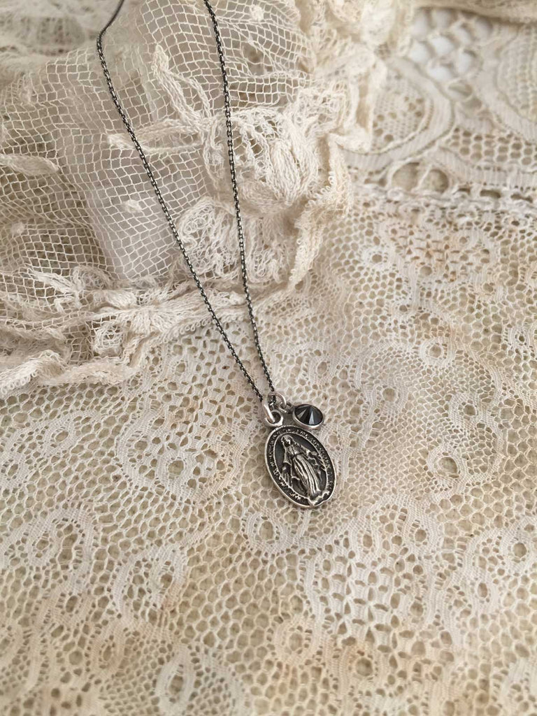 925 silver madonna pendant with a small black zirconia pendant on a fine silver oxidized chain.