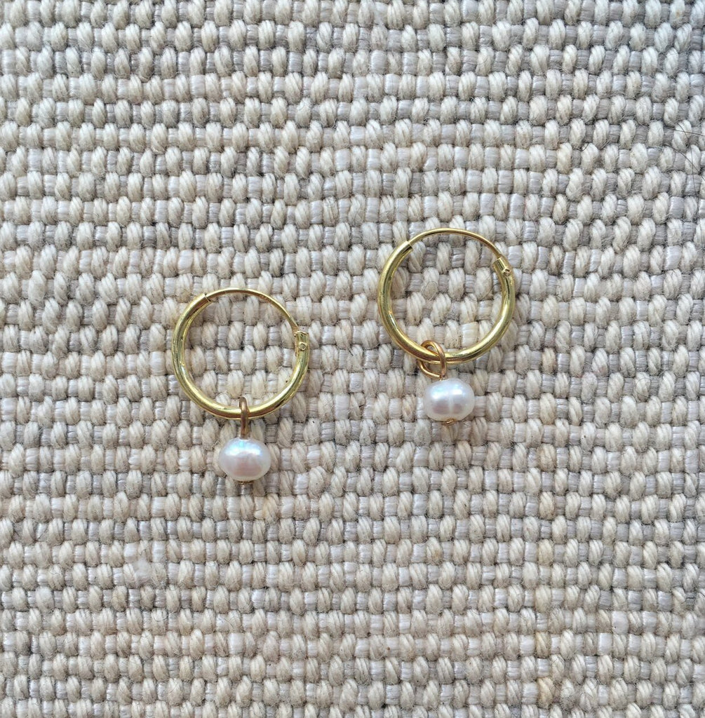Delicate gold plated silver hoop earrings with tiny sweet water pearl. this minimalist style earring suits every outfit.