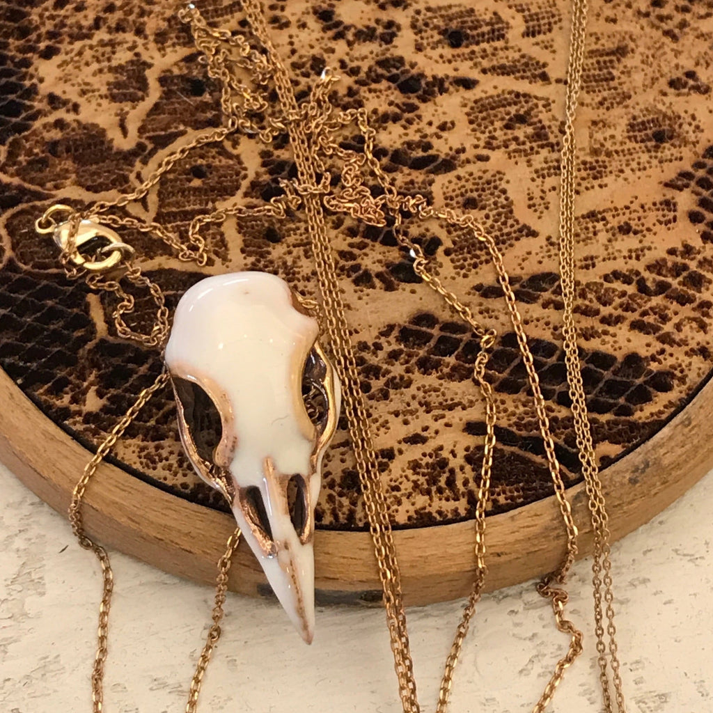 Painted bronze 'bird skull' necklace with dark oxidized bronze fine ball chain